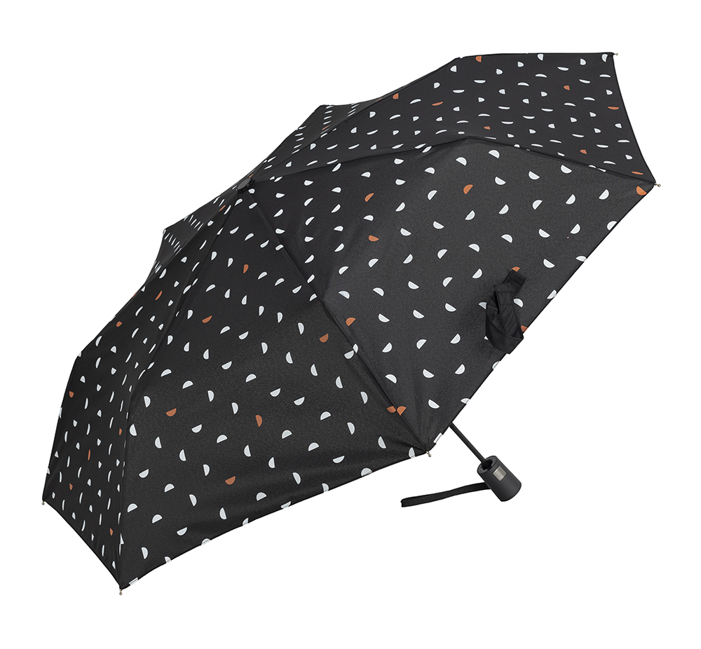 Paraguas plegable blanco y negro con toques de color y con apertura automática.